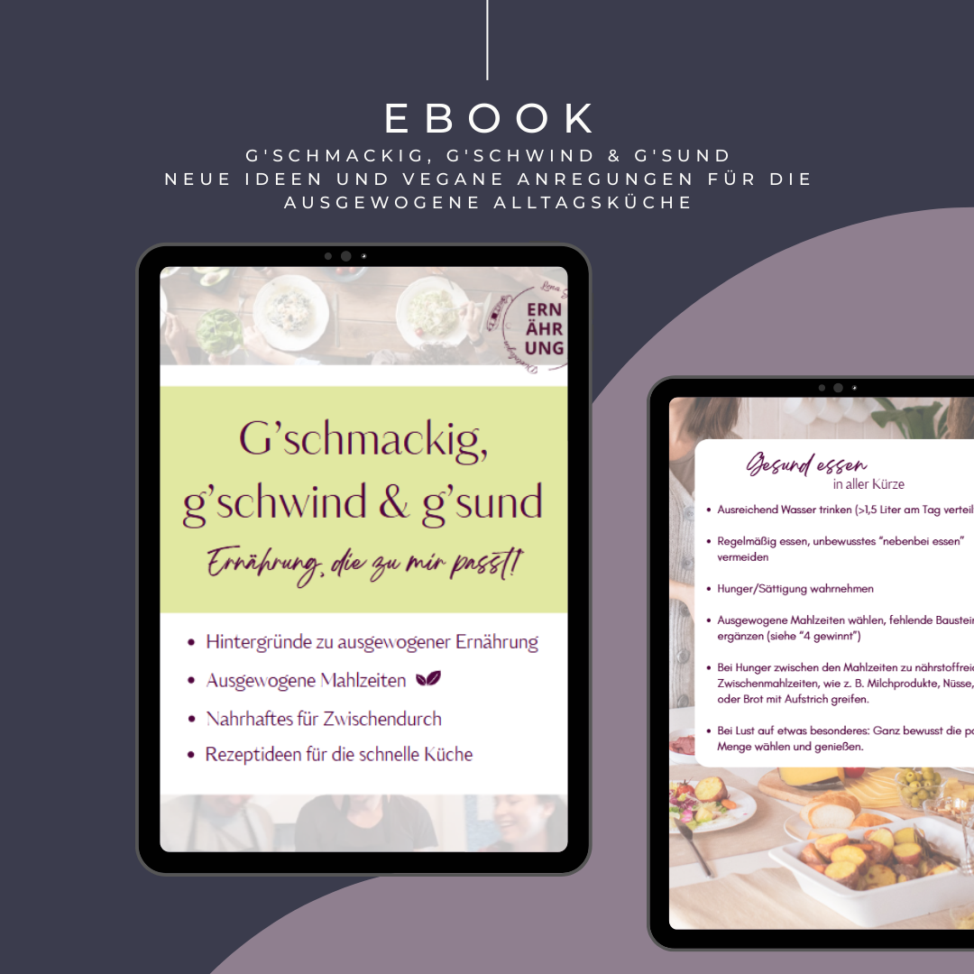 Mit dem E-Book „G’schmackig g’schwind & g’sund“ kochst du alltagstauglich, vegetarisch oder vegan – schnell, lecker und ohne Stress.