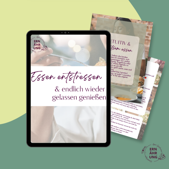Das E-Book „Essen entstressen & endlich wieder gelassen genießen“ hilft dir, Schuldgefühle loszulassen und Ernährung bewusst zu genießen.
